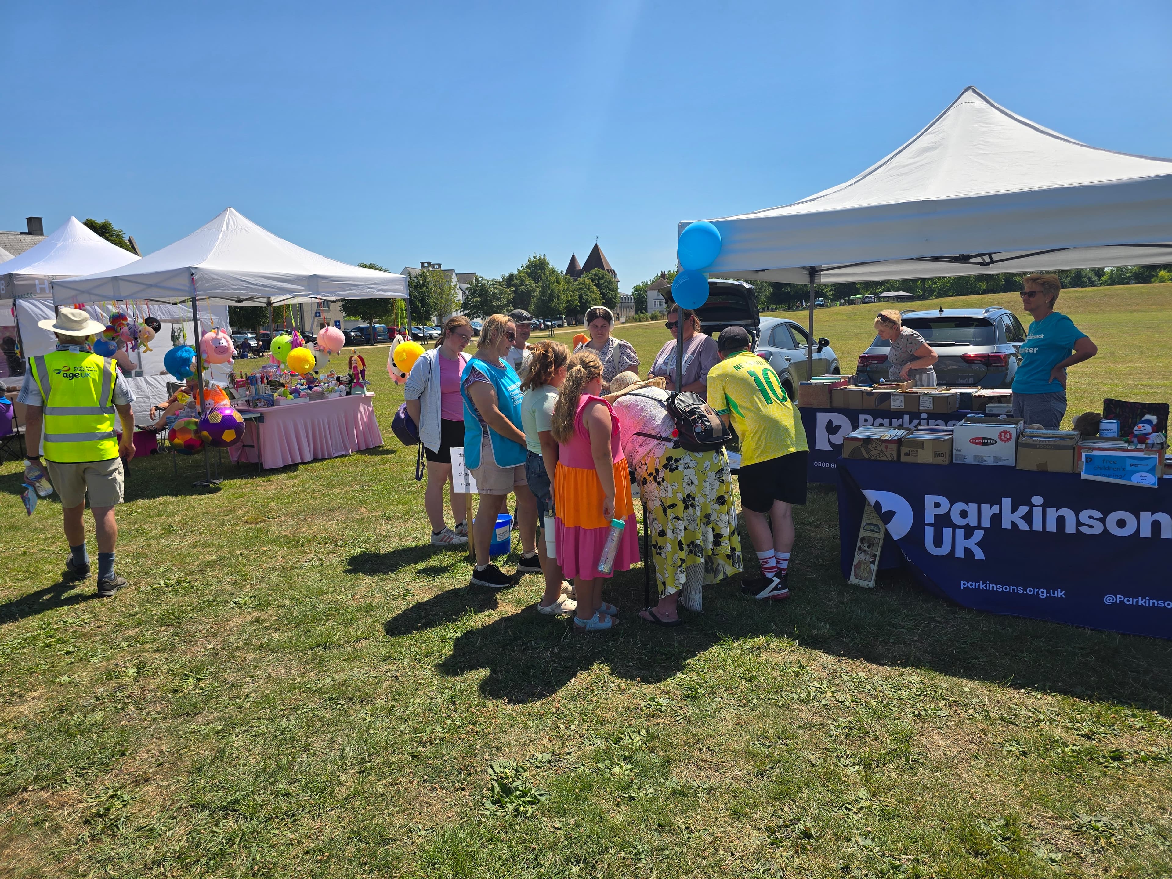 On a very hot Sunday 13th July we took part in the Age UK Summer Fayre on the Great Field, Puundbury, Dorchester. We put up our usual stall with our treasure map designed by our very own Jim Bayliss, where we sold squares on our Treasure Hunt. We also took loads of books from our bric-a-brac store as a side line that has proved popular in the past. After deducting the pitch fee and Treasure Hunt prizes we made a profit of £183.87 to support people living with Parkinson's in our area. Thank you to all who helped us on the day.